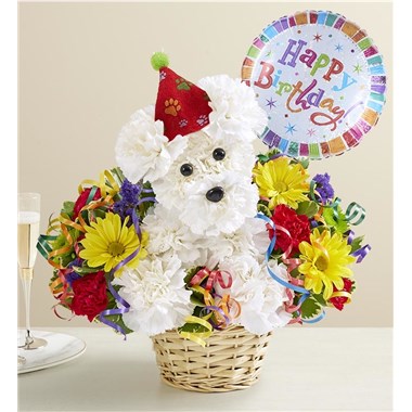 Turning another year older is a lot more fun with our signature birthday a-DOG-able! This party pooch arrives wearing a festive hat, surrounded by a mix of colorful blooms to liven up their celebration. A great gift idea for any age, he’s here to deliver your best wishes in original style.